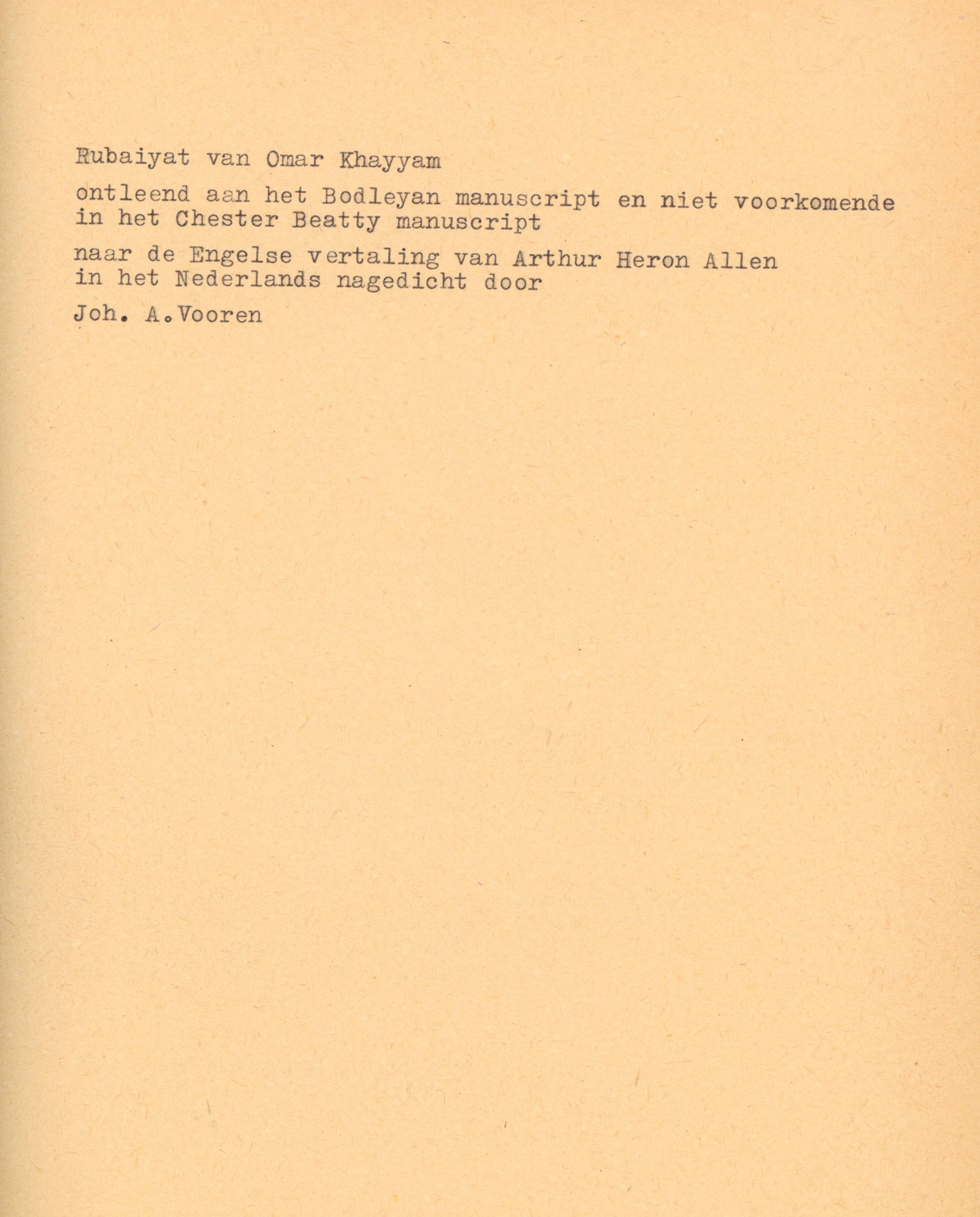 Rubaiyat van Omar Khayyam | ontleend aan het Bodleyan manuscript en niet voorkomende in het Chester Beatty manuscript naar | naar de Engelse vertaling van Arthur (sic) Heron-Allen | in het Nederlands nagedicht door | Joh. A. Vooren