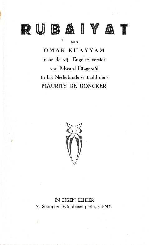 Rubaiyat van Omar Khayyam. Naar de vijf Engelse versies van Edward FitzGerald in het Nederlands vertaald door Maurits de Doncker. Gent, [1951]