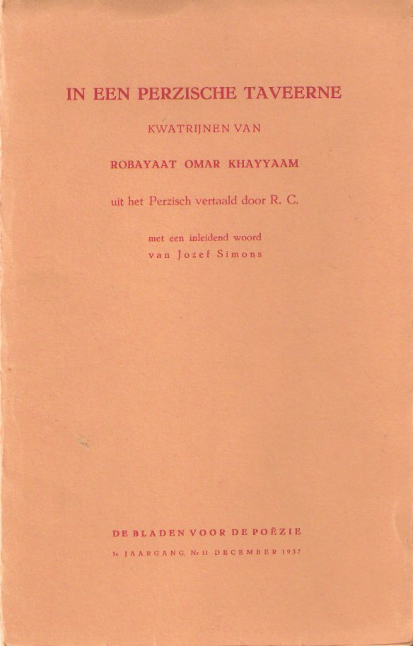 In een Perzische taveerne. Kwatrijnen van Robayaat Omar Khayyaam uit het Perzisch vertaald door R.C. met een inleidend woord van Jozef Simons. [S.l.], Bladen voor de Poëzie, 1937. (Bladen voor de Poëzie, vol. 1 (1937), nr. 11 (dec.)