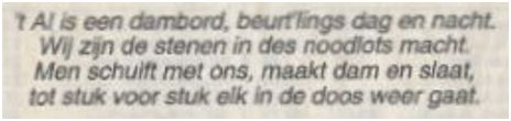 | Onbekend | “’t Al is een dambord, beurt’lings dag … | NRC | 9-1-1991 | 1991 | onbekend | nrc | 1991 |