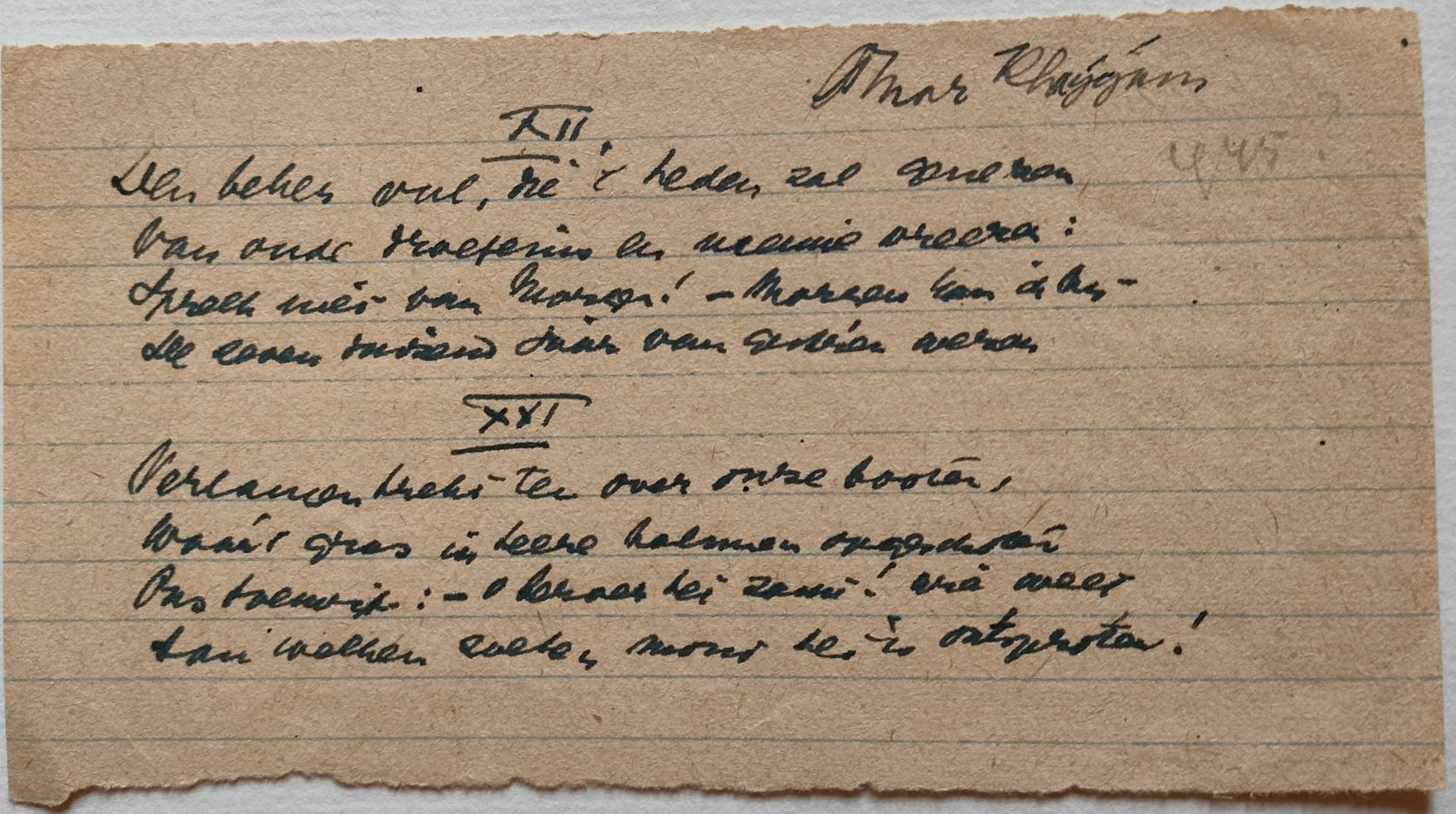 Bij een eerste zoektocht in bestaande vertalingen kwam ik met “Den beker vul, …” al snel uit bij een vertaling van H.W.J.M. Keuls (nr. 13 in de reeks Vijftig kwatrijnen van Omar Khayyám, uit 1947). Zou dit als een soort motto dienen voor de rest van het handschrift? Vervolgens kon ik, met enige moeite, de tekst van het eerste kwatrijn uit de serie thuisbrengen als eveneens een vertaling van Keuls, en wel het eerste kwatrijn: