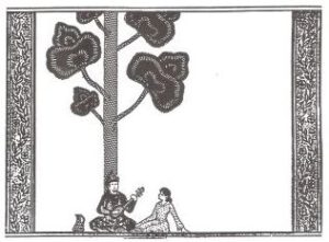 We zien twee figuren onder een (gestileerde) boom in een setting die min of meer overeenkomt met de voorstelling in het betreffende kwatrijn. De details verschillen in allerlei opzichten, op één uitzondering na en die zit in het gebladerte van de boom: hoewel de takken anders aan de boom zitten is het gebladerte op dezelfde manier weergegeven. Dat kan geen toeval zijn, maar het is een aanknopingspunt dat voorlopig nog nergens naar toe leidt.